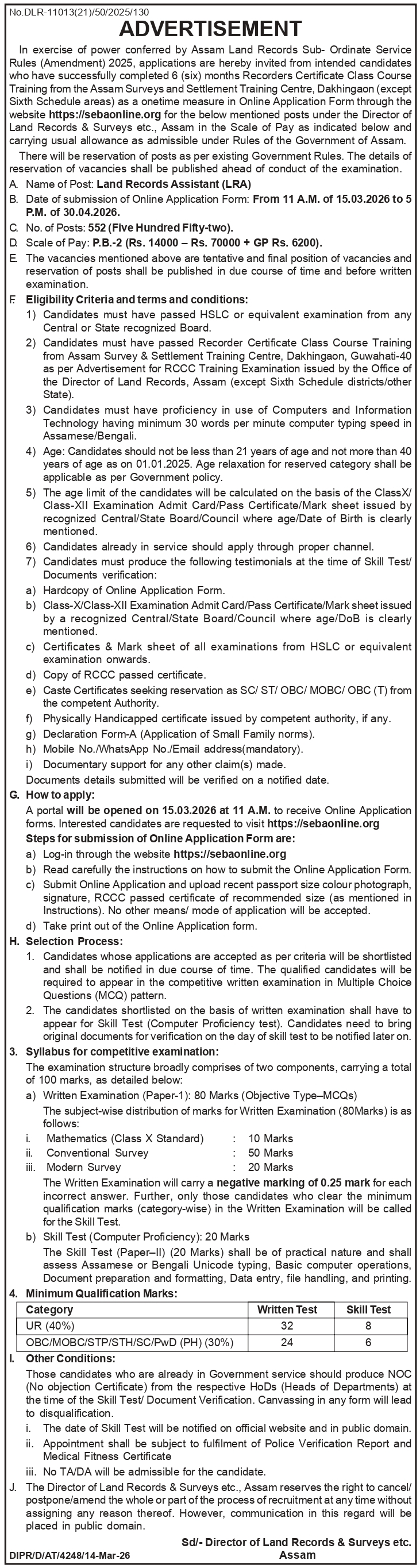 Land Records Assistant -552 Posts under Directorate of Land Records & Surveys etc.,Assam View